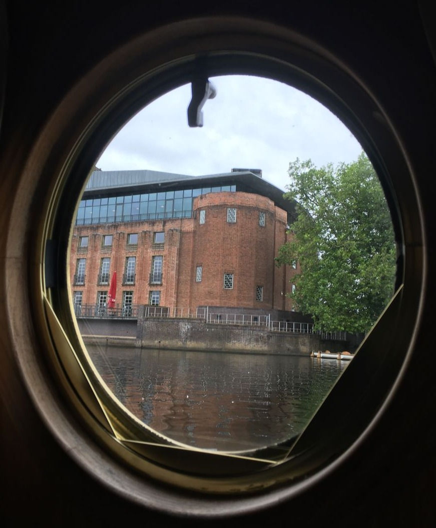 Navigation Trust licence and we were good to go. Dave joined us for the descent down the lock and across the river to a lovely spot by the park with the theatre looming over us on the other side (see 'Porthole' pic!) - just the place for Martyn to wave at us, dictator-like, from a balcony pre-matinee! We enjoyed meeting his wife Margo the following morning and were introduced to the delights of Bobby's, a wonderful cafe in a converted train carriage near the racecourse.